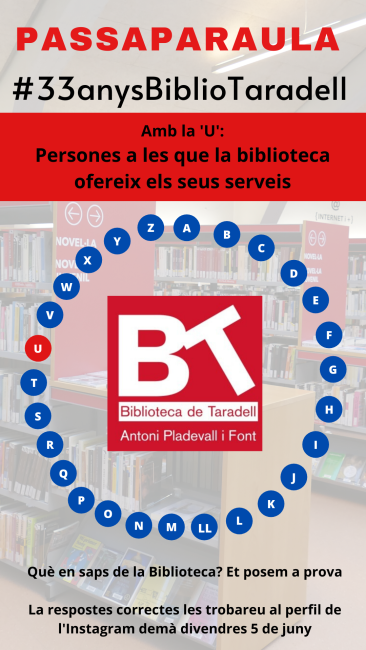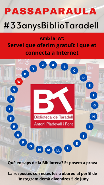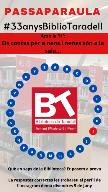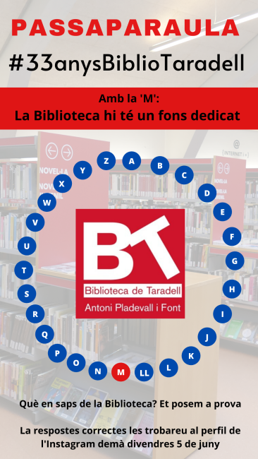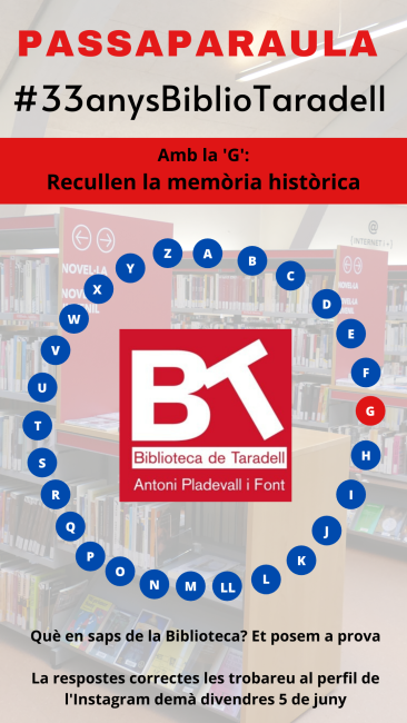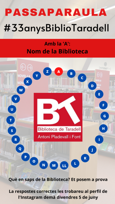 Per altra banda, s'ha dedicat El trivial de Taradell diari que fem des d'Instagram a la Biblioteca i finalment, també a l'Instagram s'ha fet un Passaparaula sobre la Biblioteca i que pots veure a continuació. Si en vols saber les respostes, posa't en contacte amb nosaltres (b.taradell@diba.cat)
