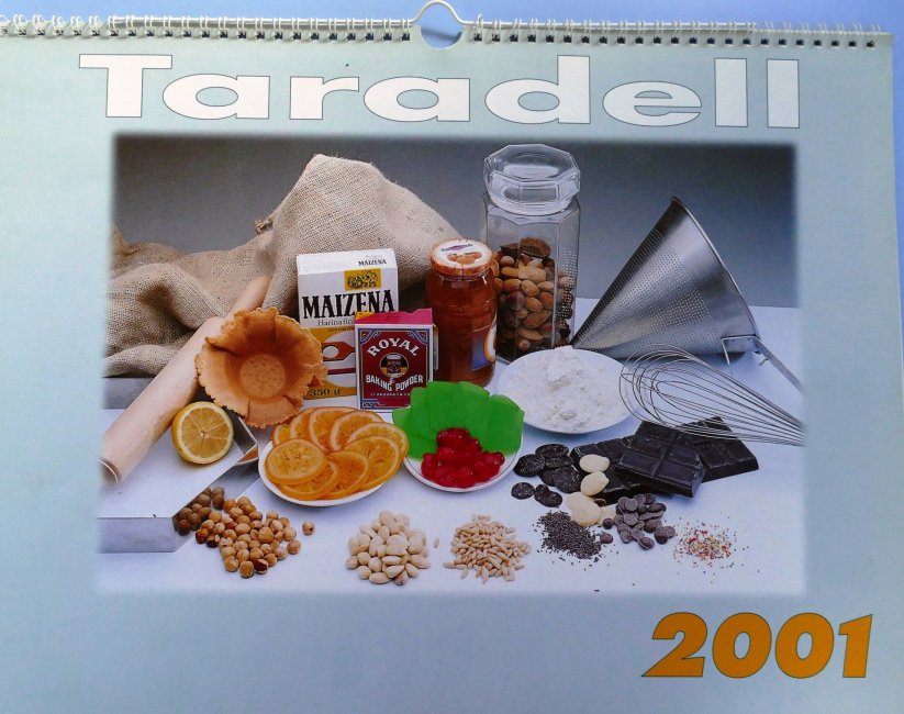 Les receptes de postres de les pastisseries de Taradell (Claret, Sant Genís, Sant Sebastià i Mont-rodon), amb fotografies de cada una d'elles, van ser el tema del calendari del 2001. Es va escollir, per cada mes, unes postres típiques de l'època: el tortell de reis, la coca de llardons, la crema de Sant Josep, la mona de Pasqua, el pastís de fruites confitades, la coca de Sant Joan, el gelat, el pastís d'en Toca-sons, el pastís de fruites del bosc, la Sara, els panellets o el torró de gema.