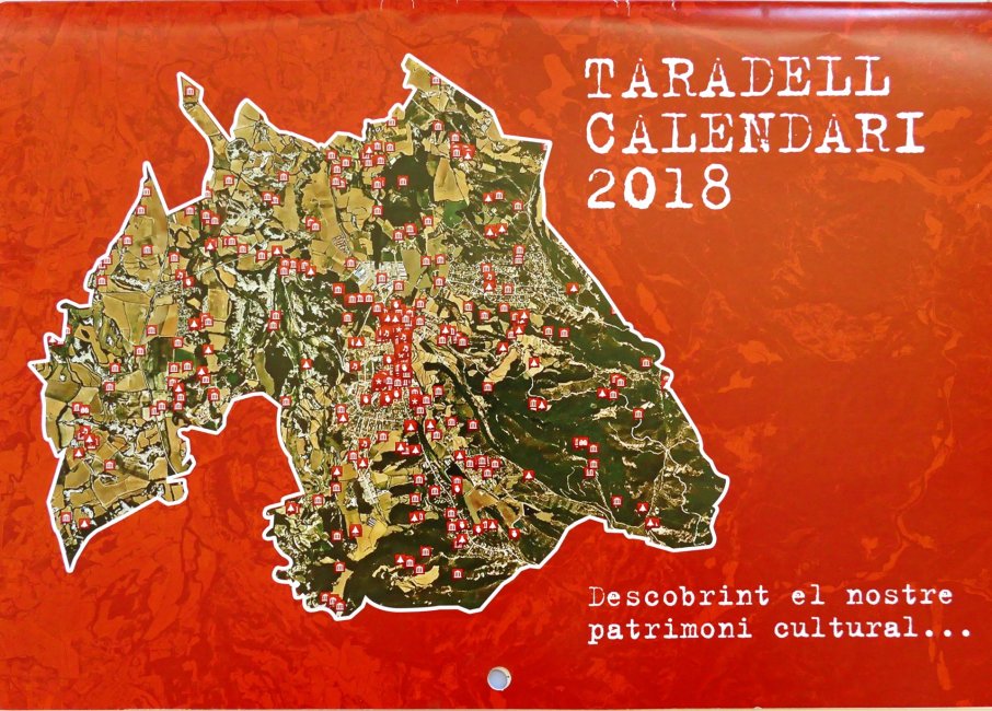 El tema escollit pel calendari del 2018 va ser el Patrimoni Local. Sota el nom 'Descobrint el nostre patrimoni cultural...', es van escollir dotze fitxes del mapa de Patrimoni del municipi i cadascuna compta amb una fotografia i una breu explicació. Entre les dotze fitxes hi ha la Cavalcada de Reis, Fites de demarcació dels límits de la població i de província, Sínies, ermites, fonts, monuments, documents històrics, llindes, entre altres llocs o coses poc conegudes que s'han descobert realitzant el mapa de patrimoni. El calendari finalitza amb un recull de fotos i el poema 'El poble' de Miquel Martí i Pol fent referència a una altra part del patrimoni de Taradell que no es pot inventariar, les persones.