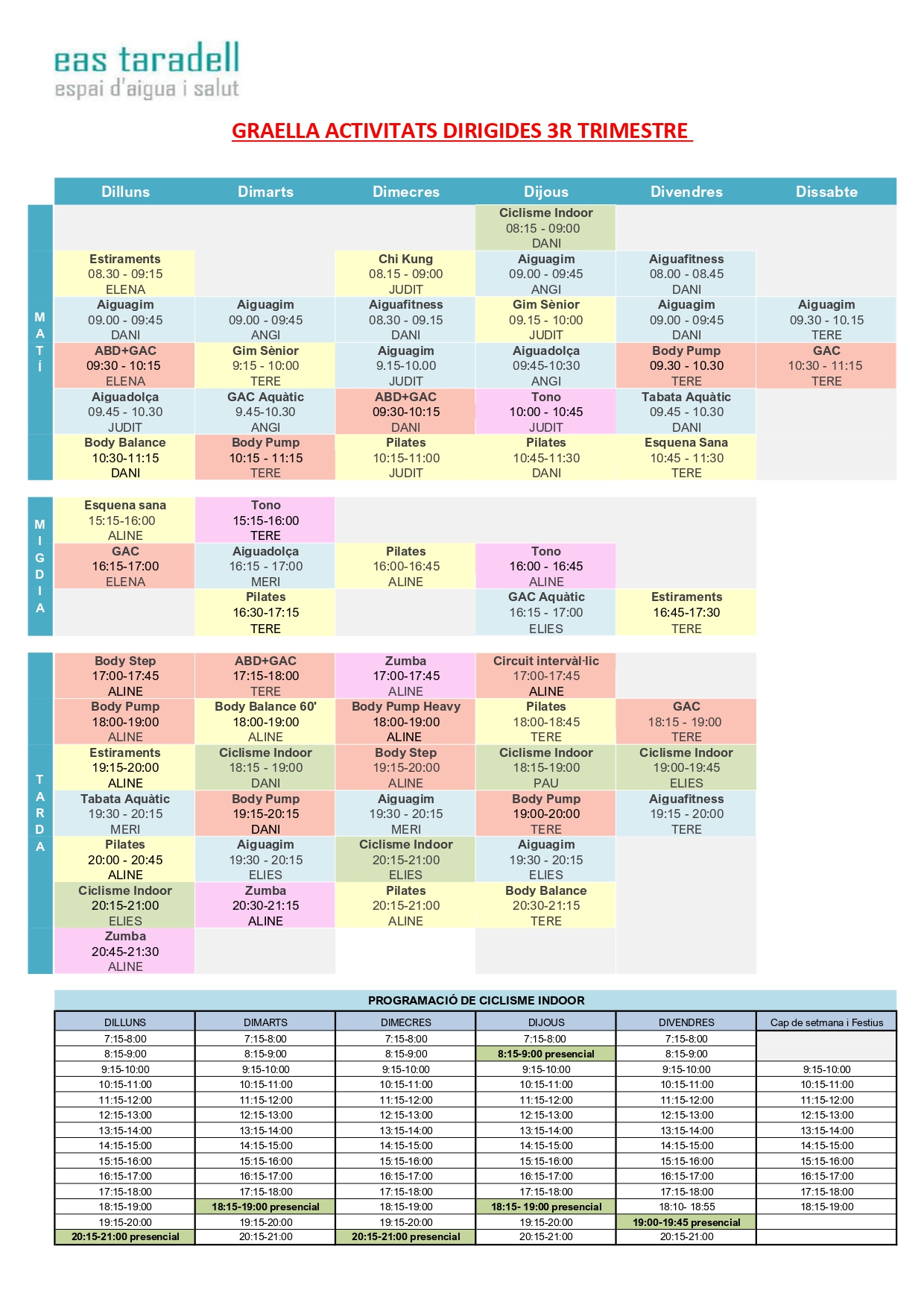 Ja tenim aquí la graella d'activitats del 3r trimestre amb data d'inici el dimarts 7 d'abril de 2026. Oferim un ampli ventall d'activitats dirigides, tant aquàtiques com de sala, incloses en la quota i de lliure accés per als abonats.